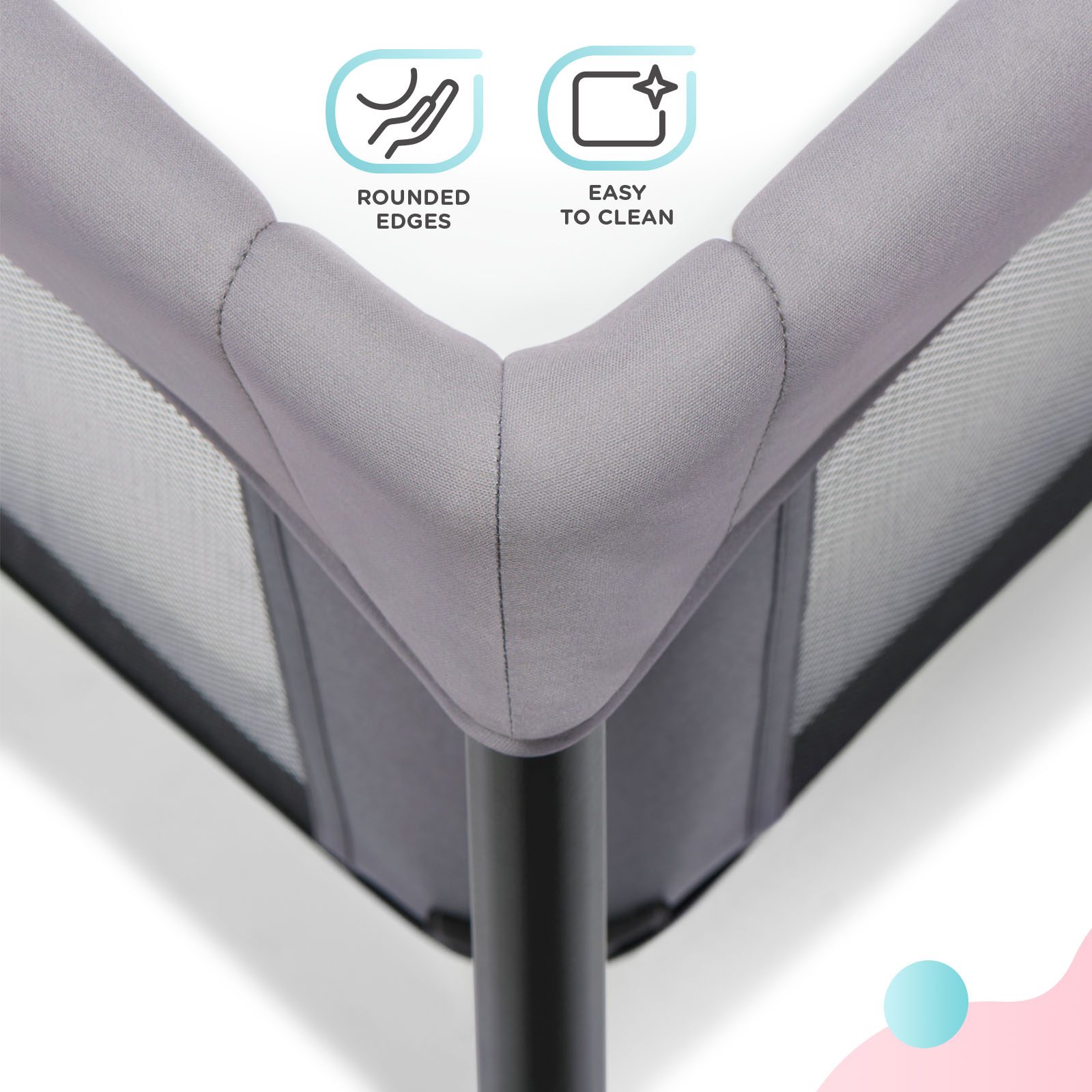 Vaše dete će biti bezbedno čak i tokom najuzbudljivije igre. Uglovi krevetića su zaobljeni i obloženi mekim materijalom koji je prijatan na dodir.